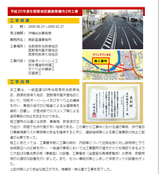 | 平成18年度与那覇地区舗装修繕工事 | 沖縄総合事務局 | 2006.08.19〜2007.03.12 |